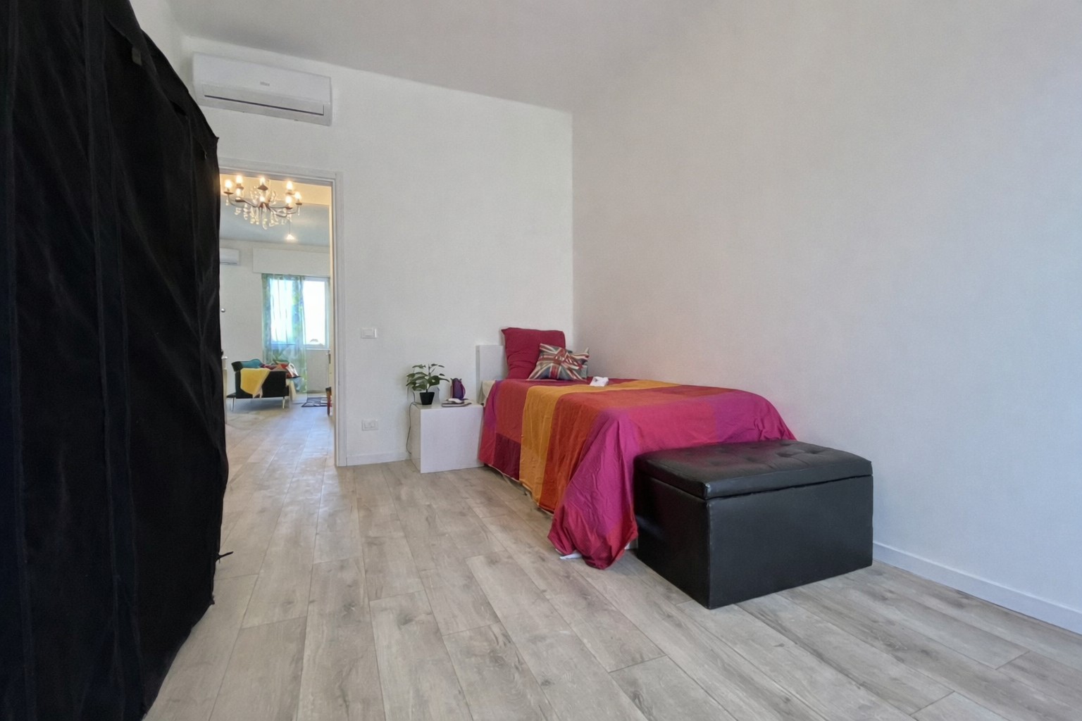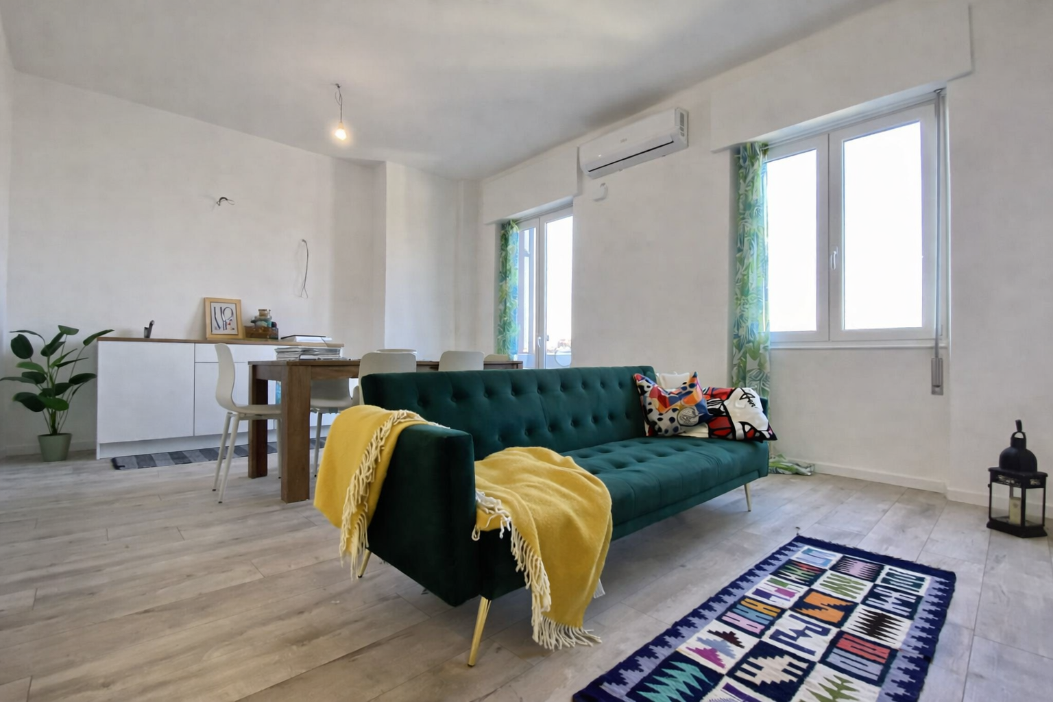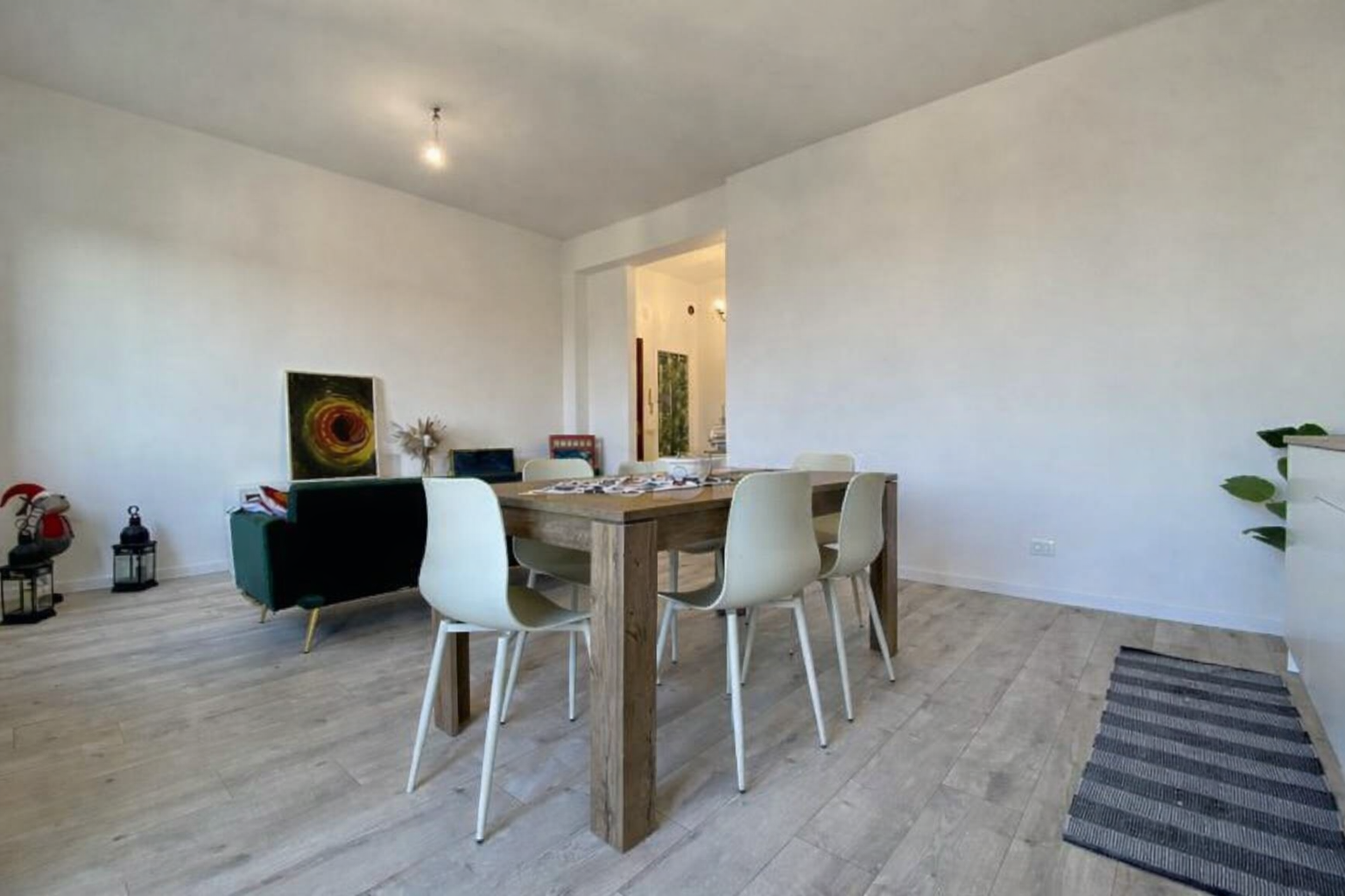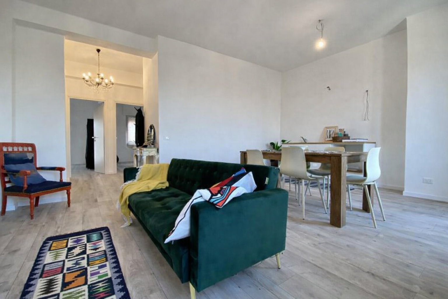 L’appartamento è stato oggetto di una ristrutturazione totale, studiata per valorizzare al massimo gli spazi e migliorare comfort ed efficienza. La zona giorno è stata trasformata in un ampio e luminoso open space grazie all’abbattimento del muro tra cucina e soggiorno, creando un ambiente moderno e accogliente.